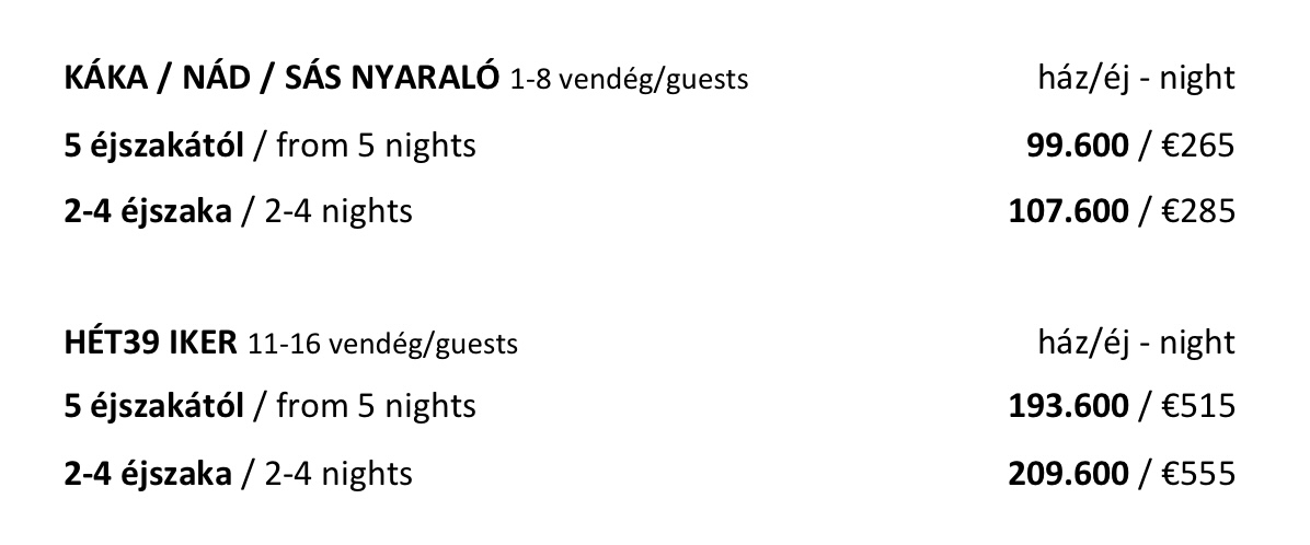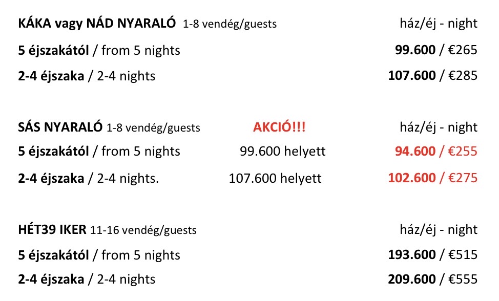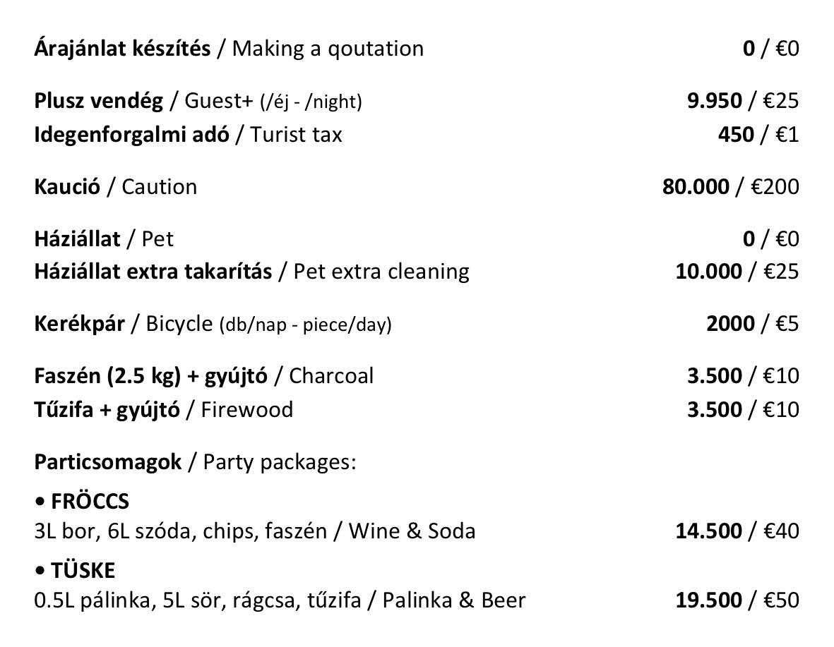 Fenti árak, minden esetben tartalmazzák, az alábbiak korlátlan használatát (nyáron): teljesen felszerelt apartman / szállás / friss ágynemű / fürdőlepedő / törölköző / légkondicionáló / internet-wifi / medence / saját udvar / kerti grill és bogrács / szabadstrand és napozóstég / petanque-, lábtenisz - tollaslabdapálya / kerékpár / gondozott kert / autóbeálló, illetve, a végtakarítás / ÁFA költségeit.